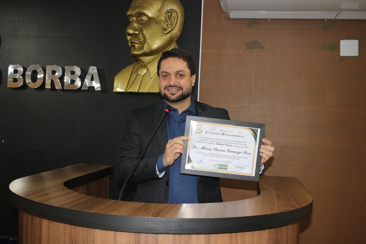 Entre os destaques da noite, o Dr. Vinícius Pires foi homenageado pela vereadora Amanda Fraga, que lhe concedeu o Título de Cidadão Miracemense. A honraria reconhece os relevantes serviços prestados por Dr. Vinícius como médico e vereador da capital Palmas, destacando seu compromisso com a saúde pública e o bem-estar da população tocantinense.