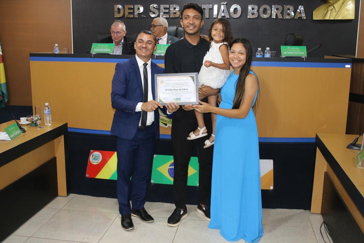 A solenidade também contou com a entrega de Moção de Aplausos ao jovem empreendedor Wattila Silva, que recentemente inaugurou sua nova barbearia. A homenagem destaca sua iniciativa, coragem e contribuição para o fortalecimento da economia local, além de servir de inspiração para outros jovens miracemenses que acreditam no potencial do município.